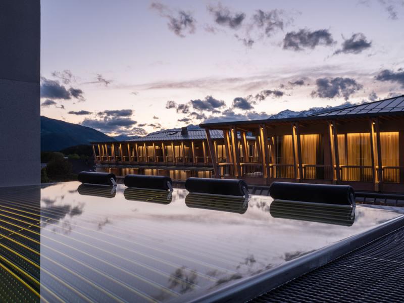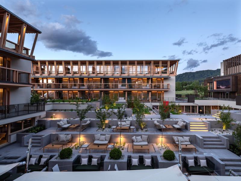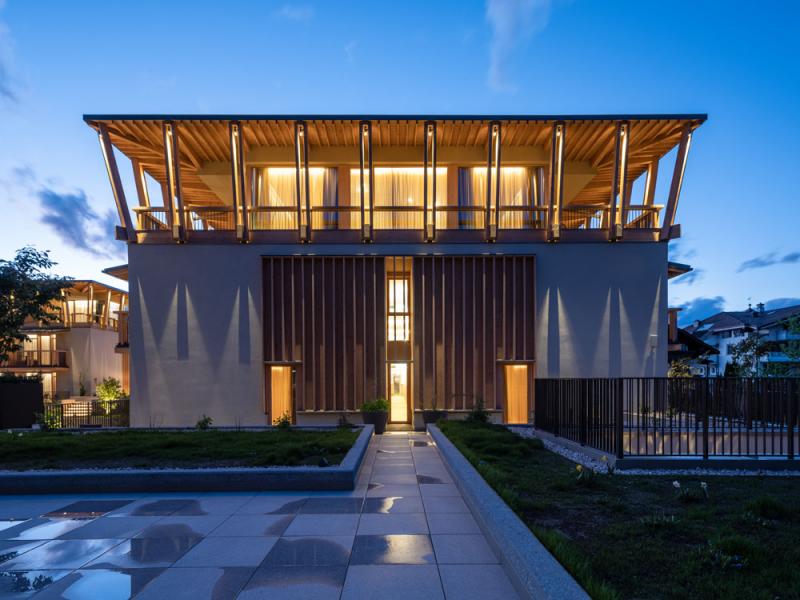 La iluminación en este complejo utiliza luminarias Platek para acentuar la arquitectura contemporánea y los espacios comunes, logrando un ambiente sofisticado y acogedor. Luces empotradas en el suelo y en los jardines realzan la vegetación y delimitan visualmente las áreas de descanso y circulación. Las escaleras están iluminadas con líneas de luz indirecta, garantizando seguridad y resaltando los niveles del espacio. En las terrazas, las luces cálidas crean una atmósfera íntima en cada balcón, integrando cada elemento arquitectónico en una composición armónica que se complementa con el entorno natural y las montañas al fondo.