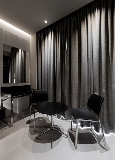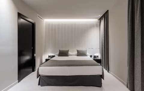 En esta habitación de hotel, el diseño de iluminación ha sido cuidadosamente ejecutado con soluciones de Delta Light, creando un espacio que invita al descanso y al confort. La iluminación indirecta instalada en la pared trasera de la cama ofrece una luz suave y envolvente que realza la estética minimalista de la estancia. Este efecto de luz difusa proporciona una atmósfera cálida y acogedora, ideal para momentos de relajación.