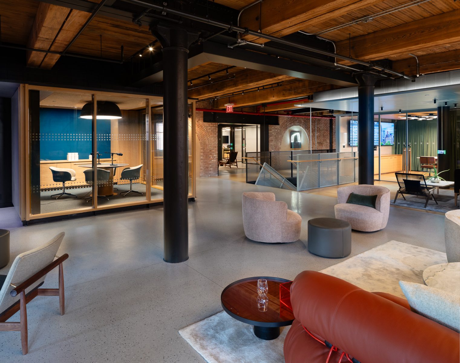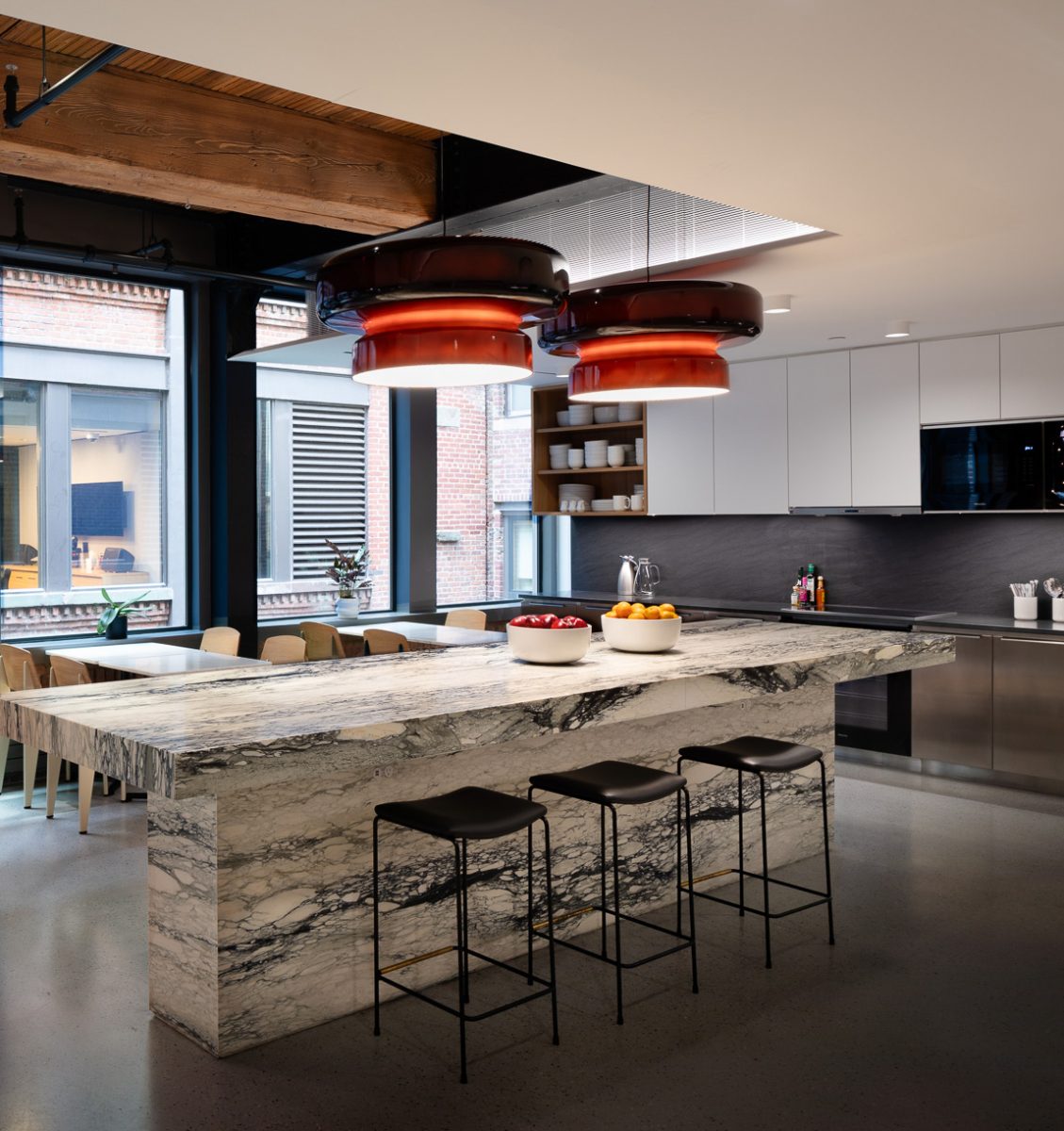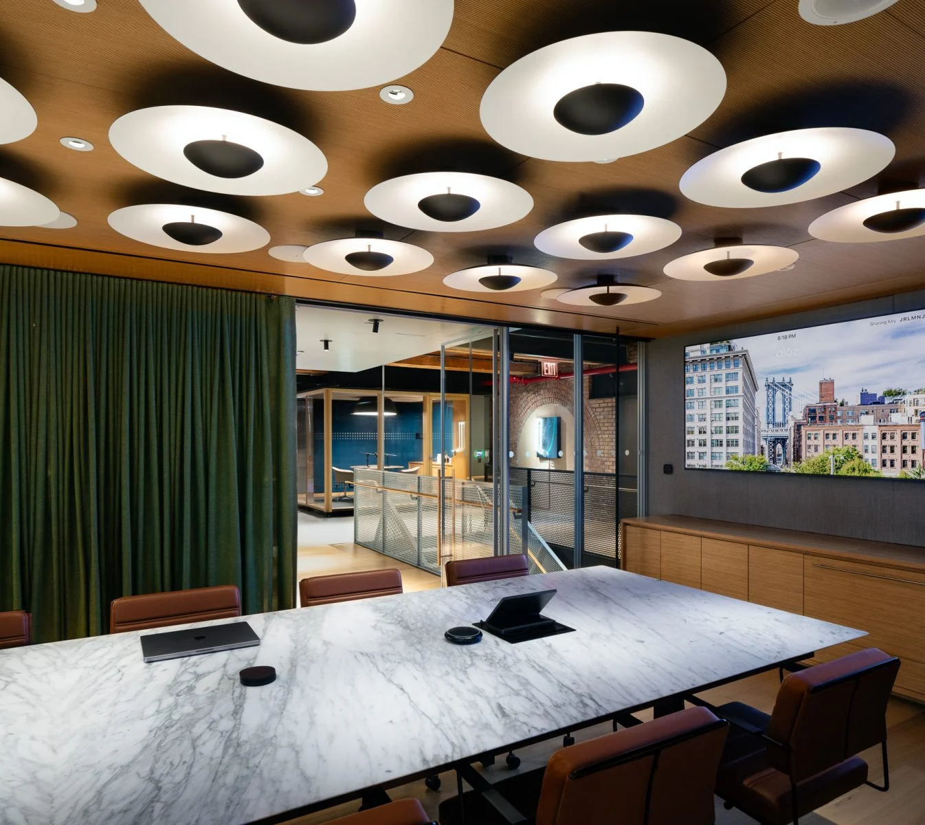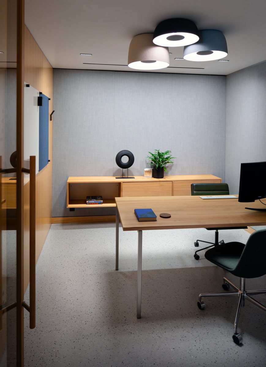En esta oficina moderna, la iluminación de Marset juega un papel fundamental en la creación de un ambiente elegante y funcional. En la sala de reuniones, una serie de lámparas de techo de diseño minimalista ilumina la mesa de mármol, ofreciendo una luz suave y bien distribuida que reduce el deslumbramiento y crea un ambiente propicio para la concentración. La luz indirecta destaca el techo texturizado y añade profundidad al espacio. Además, el uso de una cortina verde permite cerrar visualmente el área de reuniones para mayor privacidad, mientras que el cristal permite que la luz natural y la vista hacia los espacios comunes se integren en el diseño. Este esquema de iluminación está diseñado para satisfacer las necesidades tanto de trabajo colaborativo como de momentos de relajación en la oficina.