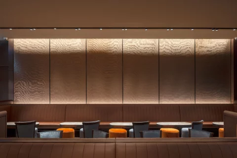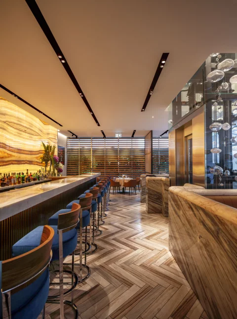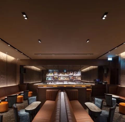 El sistema de iluminación se basa en luminarias montadas en rieles, permitiendo una versatilidad total y una distribución de luz cuidadosamente orquestada. La iluminación puntual sobre las mesas acentúa la exclusividad de los materiales elegidos, como el cuero y el mármol, resaltando sus texturas y realzando la estética del espacio. Al mismo tiempo, la suave luz ambiental se difumina en las paredes, cuyas texturas aportan una sensación envolvente y sofisticada, creando zonas de sombra y luz que añaden profundidad y carácter al gastro bar.