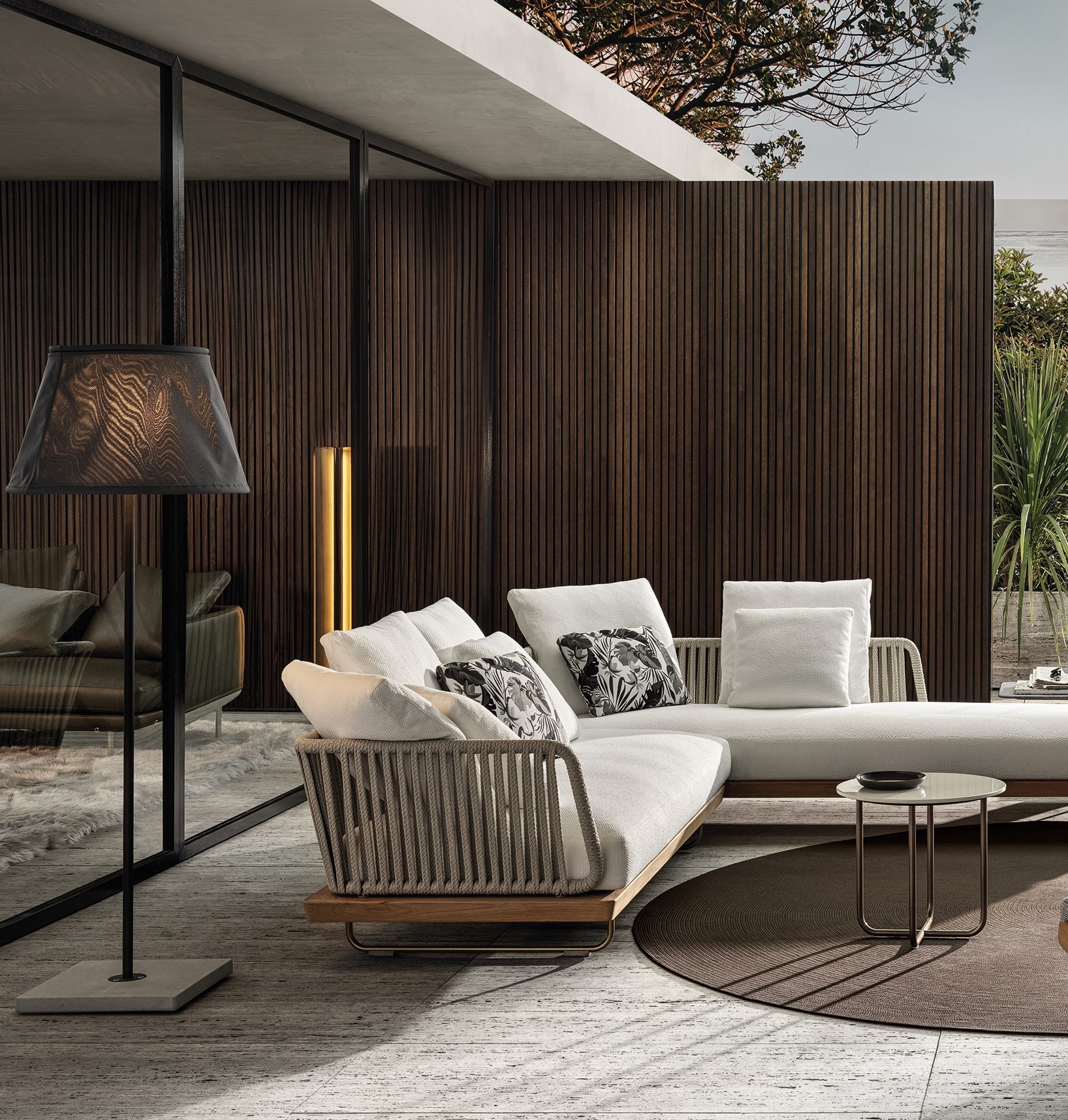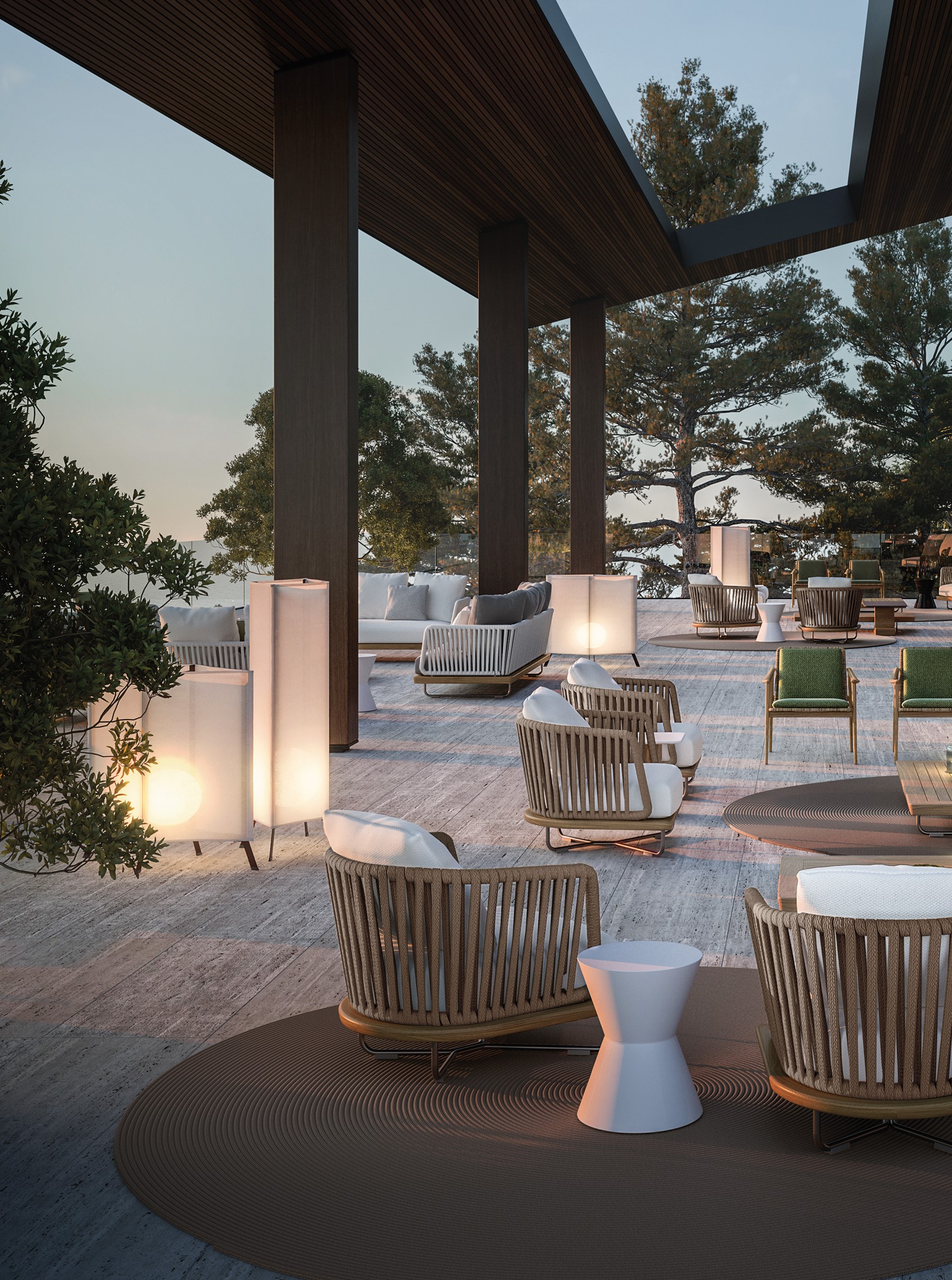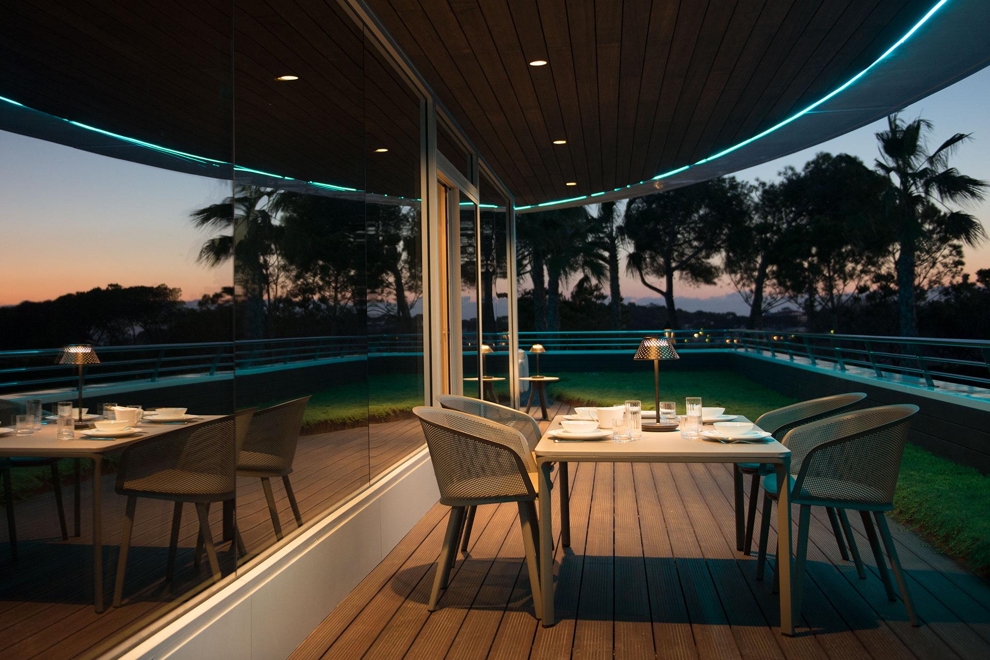 En esta terraza privada, la iluminación de Marset crea un ambiente íntimo y sofisticado, ideal para cenas al aire libre. Las lámparas de sobremesa proyectan una luz cálida sobre la mesa, generando una atmósfera acogedora sin interferir con la vista al exterior. Las luces empotradas en el techo complementan sutilmente la iluminación principal, resaltando las líneas arquitectónicas del espacio. Además, una tira de luz azulada recorre el borde superior de la estructura, aportando un toque moderno que armoniza con el entorno natural. Este diseño de iluminación equilibra funcionalidad y estética, potenciando la experiencia de uso de la terraza.